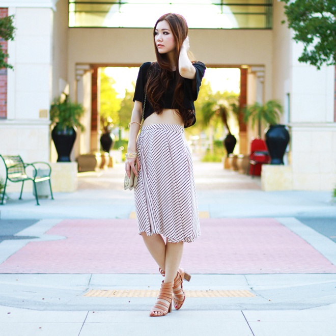 | Cũng chiếc áo len sọc xám trắng như trên, nhưng là với một phong cách mới ngọt ngào và yểu điệu hơn cùng váy hoa. |