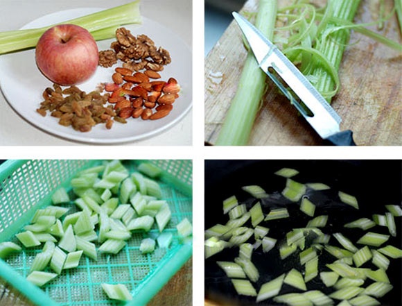 Cần tây tước bỏ xơ già, rửa sạch, cắt khối kim cương, chần sơ qua nước sôi rồi vớt ra rổ thưa cho ráo.