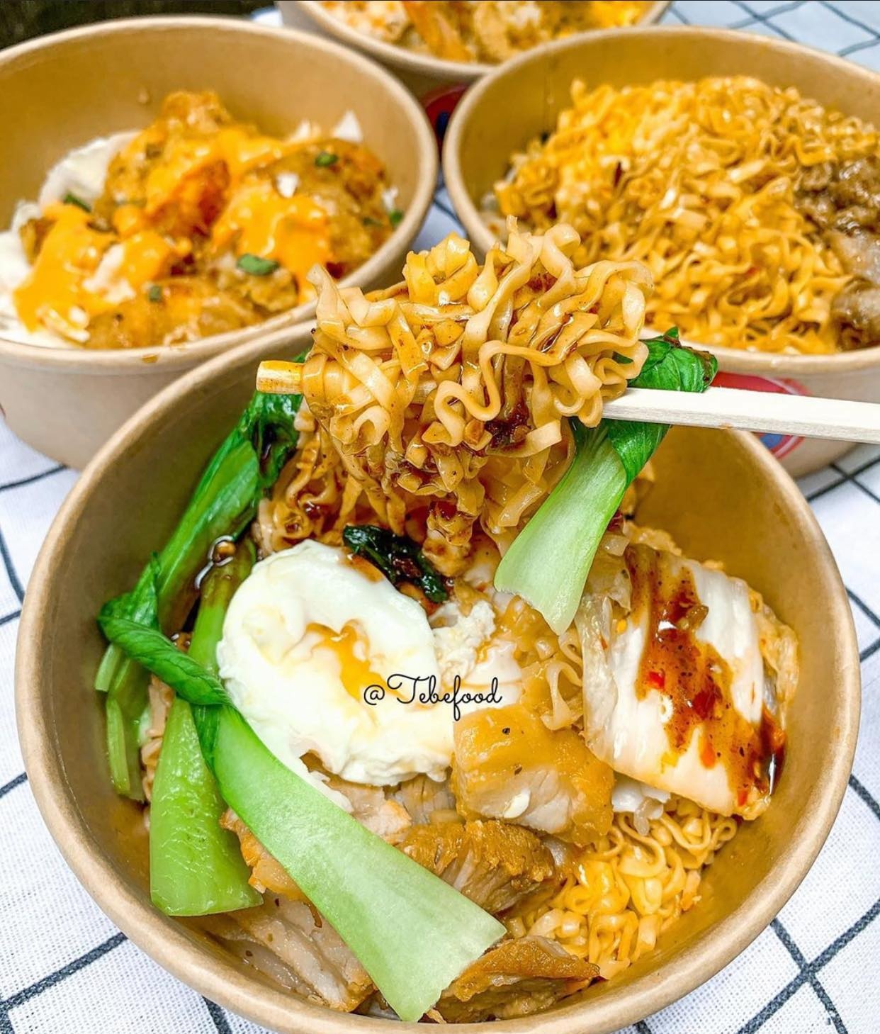 Mì bò cháy tỏi heo giòn gây ấn tượng với thực khách bởi phần thịt bò được ướp đậm đà. Rau cải xanh, trứng lòng đào và da heo chiên giòn cũng được kết hợp hài hòa trong món ăn. Bạn cũng có thể đổi vị với cơm hoàng kim xá xíu quyện trứng muối bùi béo. Món ăn được phục vụ kèm kim chi chua cay hứa hẹn giúp bạn thỏa mãn chiếc bụng đói ngày mưa. Ảnh: Citastyfood. |
