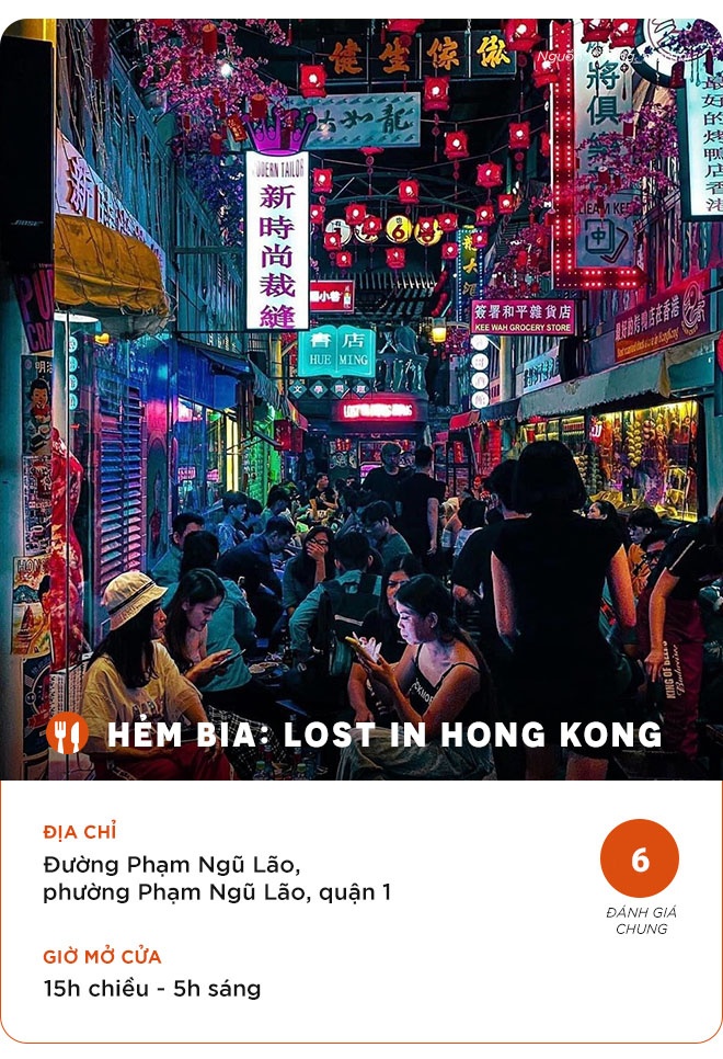Quán nằm trong con hẻm lớn trên đường Phạm Ngũ Lão thông với Bùi Viện. Với màu sắc rực rỡ của đèn led, biển hiệu neon, bạn như lạc đến xứ Cảng Thơm giữa lòng TP.HCM. Bên cạnh nhiều loại bia ngon, Hẻm bia còn phục vụ đa dạng món ăn nhẹ lạ miệng.