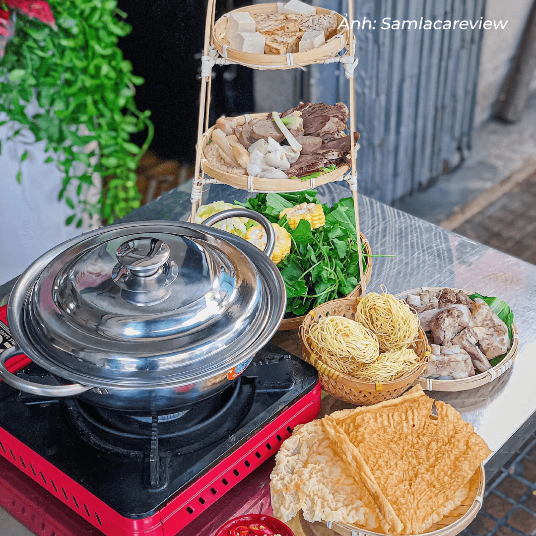 Tôi đi cùng hai người bạn, gọi phần lẩu giá 200.000 đồng. Đồ ăn được trình bày trên mẹt 3 tầng tạo cảm giác gần gũi, mộc mạc. Nhóm tôi gọi thêm bò viên vì đậm thịt, giòn ngon.