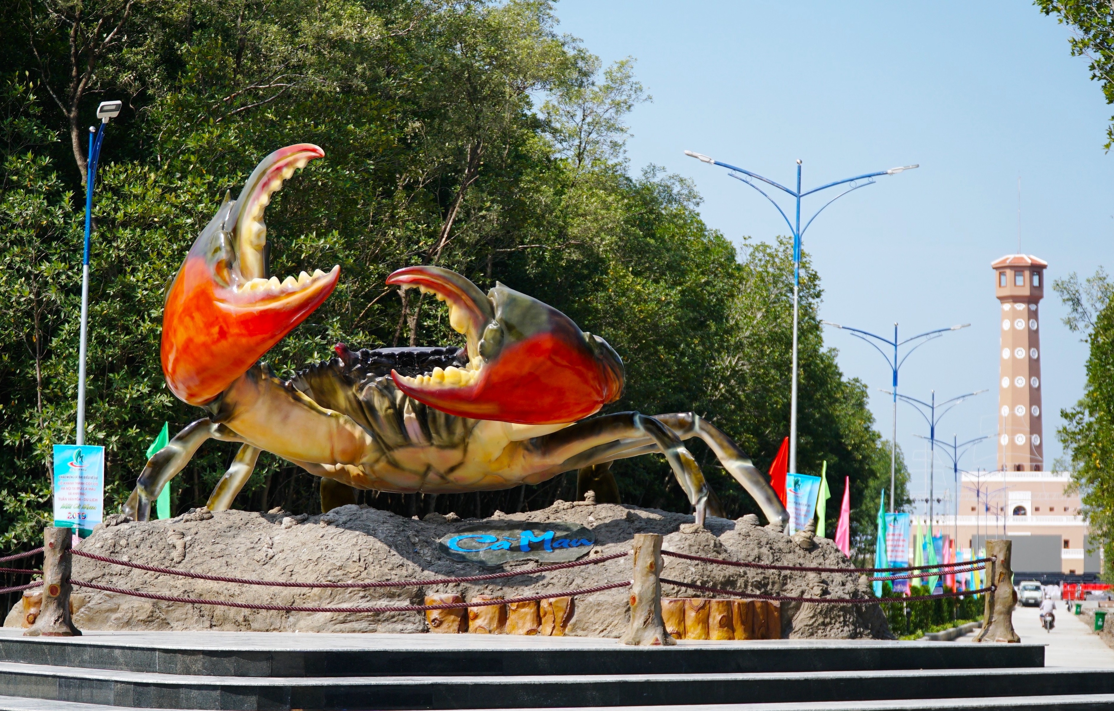 Tại công viên văn hóa - du lịch Mũi Cà Mau có vòng xoay biểu tượng con cua, một trong những đặc sản trứ danh của vùng đất Cà Mau 3 mặt giáp biển, độ mặn cao quanh năm. Hệ sinh thái rừng ngập mặn nơi đây đem lại nguồn thức ăn phong phú cho cua Cà Mau, góp phần giúp sản vật nổi tiếng này có chất lượng cao, thịt chắc, ngọt đặc trưng... Ảnh: Nguoiduatin. |