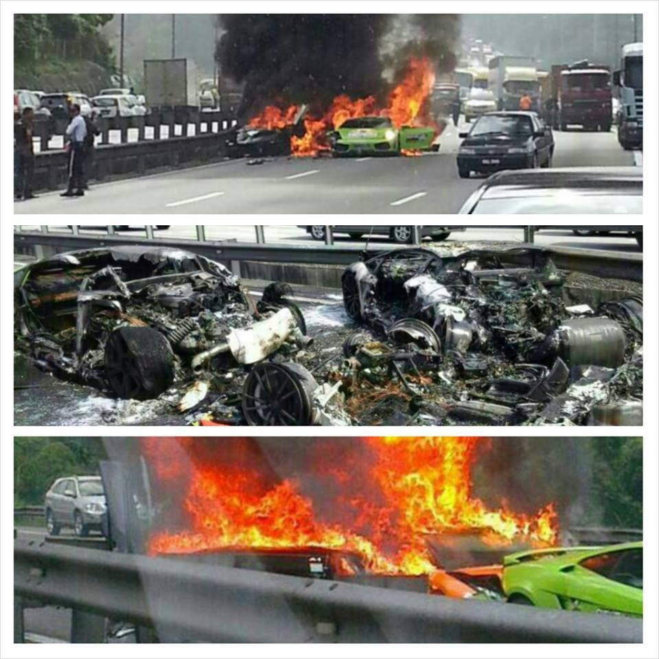 Ba siêu xe của Lamborghini bao gồm 2 chiếc Gallardo và 1 chiếc Aventador độ đã va chạm với nhau và bốc cháy tại Malaysia.