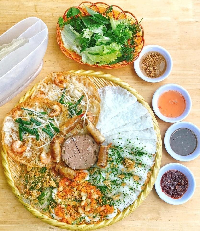 | Hầu hết món ăn được trình bày trên chiếc mẹt mộc mạc. Bánh hỏi thịt nướng, bánh xèo, bánh bèo là các hương vị miền Trung đốn tim tín đồ ẩm thực. Bạn cũng có thể nhâm nhi nem nướng, sứa trộn xoài cóc, bò lá lốt để thỏa mãn vị giác. Ảnh: Dacsanbinhdinhbangoaika. |