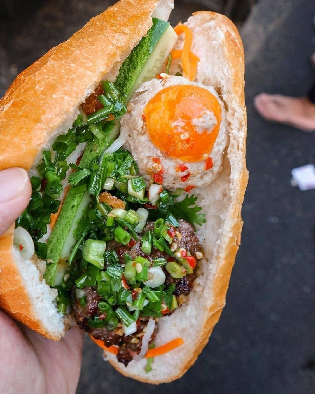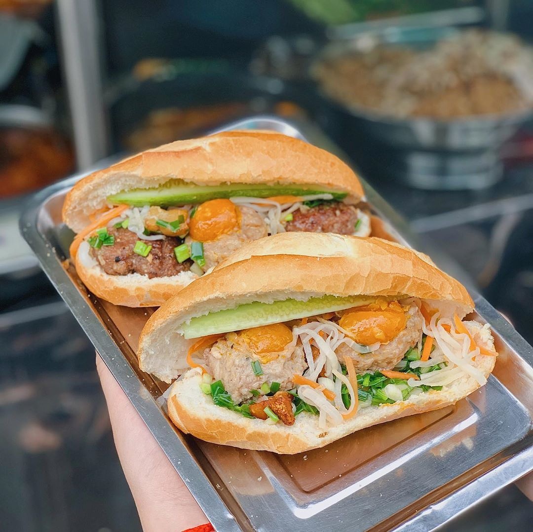 Ngoài nhân thịt nguội truyền thống, bánh mì TP.HCM còn mang nhiều hương vị hấp dẫn khác, trong đó phải kể đến nhân xíu mại. Gần đây, món ăn này hút giới trẻ Sài thành nhờ kết hợp với hương vị trứng muối béo thơm, đậm đà. Cắn miếng bánh mì vị mằn mặn đặc trưng hòa quyện trong mỡ hành, đồ chua, thịt bò nướng và tóp mỡ là trải nghiệm thực khách không nên bỏ lỡ.