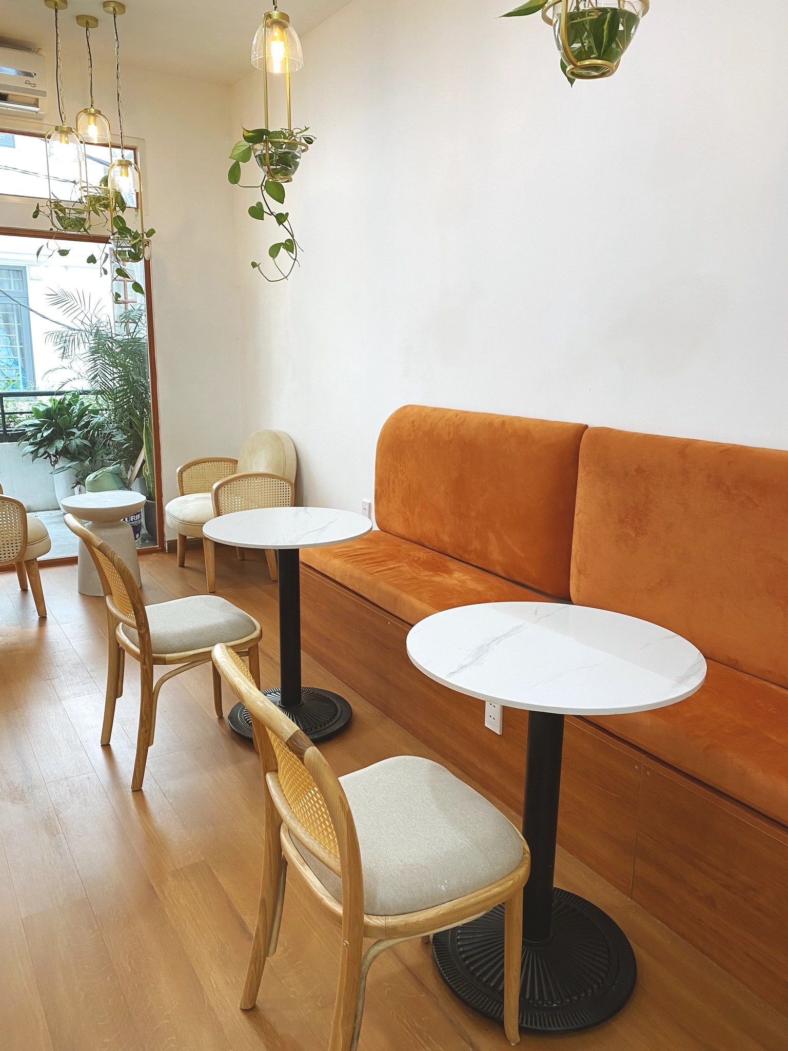 - Không gian quán thu hút nhờ tủ bánh với nhiều lựa chọn hấp dẫn và hương bánh thơm lừng lan tỏa. Lối thiết kế và trang trí tiệm khá đơn giản, cây xanh điểm xuyết, gam màu tổng thể nhẹ nhàng. Tiệm bố trí không quá nhiều chỗ ngồi nhưng mỗi góc đều có điểm nhấn riêng, phù hợp chụp hình và đáp ứng đa nhu cầu như đi một mình, hẹn hò cá nhân, trò chuyện riêng tư, họp nhóm.