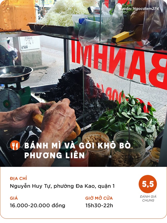 Sara Nhon: "Ổ bánh mì và đĩa gỏi với giá 16.000 đồng/món đều ngập tràn khô bò, nhìn hấp dẫn lắm. Quán có bán khô bò không nên khách có thể mua về lai rai".