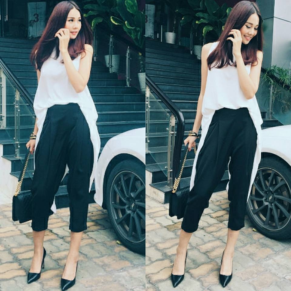 | 3. Quần ống rộng: Có khá nhiều lựa chọn với các kiểu quần ống rộng như ống suông, ống loe, ống lỡ. Thanh Hằng có cả một BST quần ống loe với nhiều màu sắc, chất liệu để khoe chân dài. |