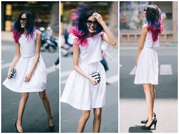 | Hoàng Thùy bỗng chốc dịu dàng với mẫu váy xòe và áo trắng tinh khôi. |