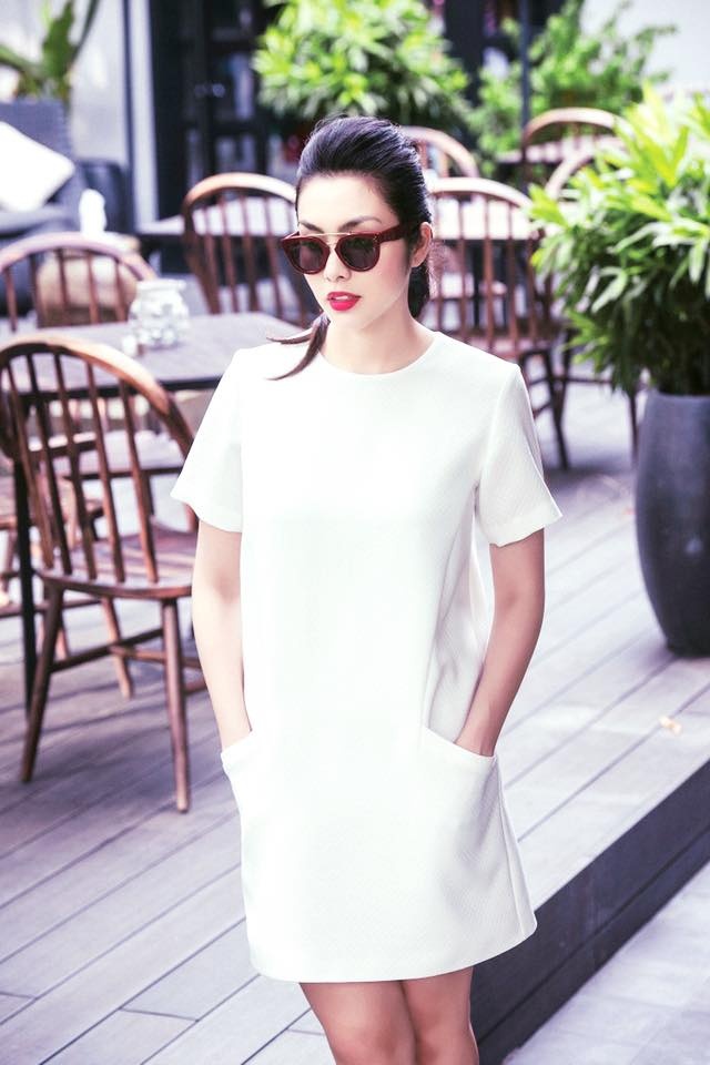| Bà mẹ một con Hà Tăng khoe vẻ thanh lịch với đầm trắng suông. |