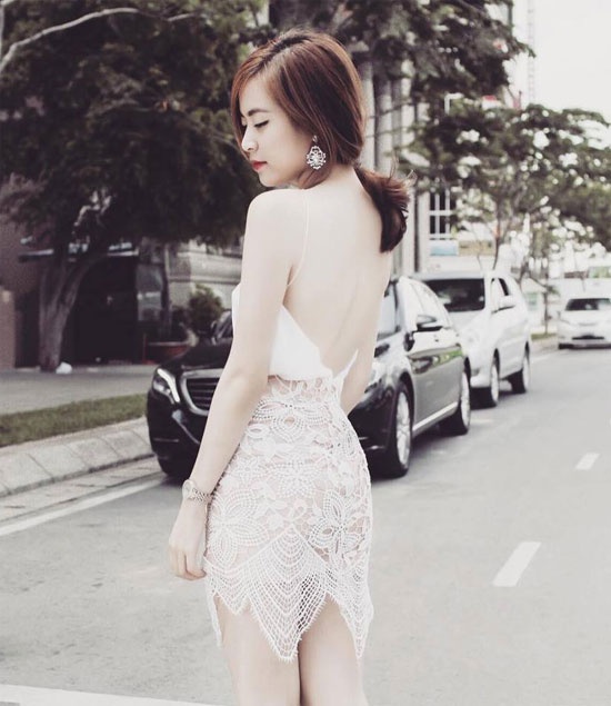 | Hoàng Thùy Linh khoe lưng gợi cảm với đầm ren trắng. |