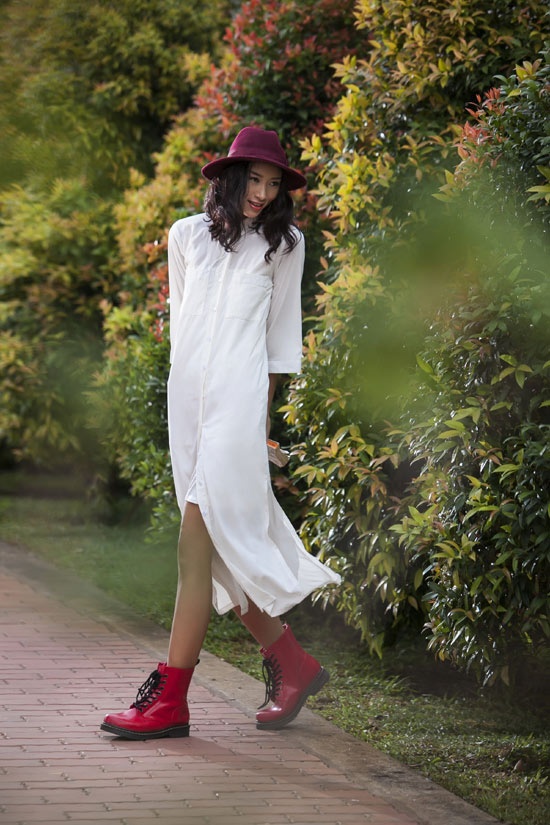 | Chân dài Quỳnh Châu với mẫu áo dài mix kèm ankle boots và quần skinny trẻ trung. |