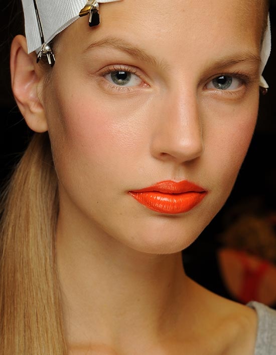 Tại buổi ra mắt bộ sưu tập xuân - hè 2014 của DKNY, chuyên gia trang điểm Charlotte Willer đến từ thương hiệu mỹ phẩm hàng đầu Maybelline New York đã khoác lên môi của toàn bộ người mẫu một lớp áo cá tính - cam neon.