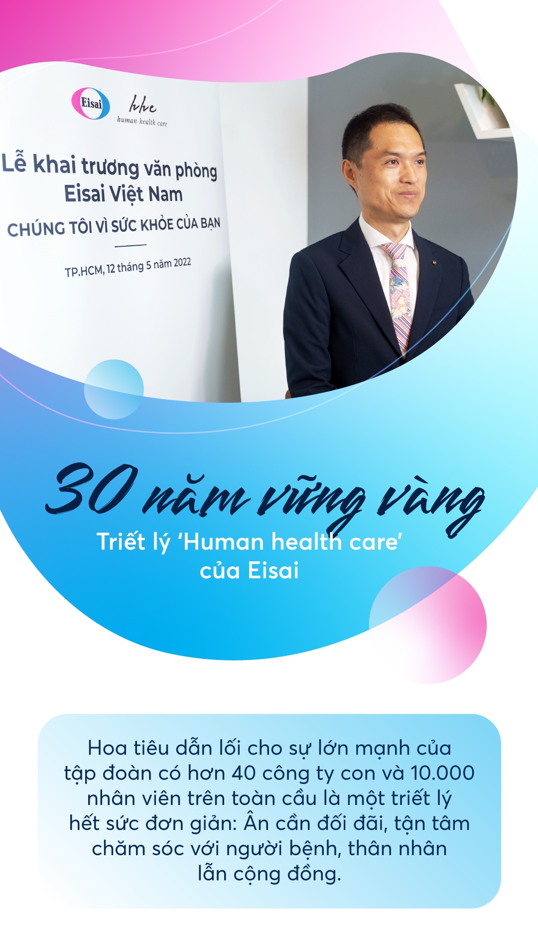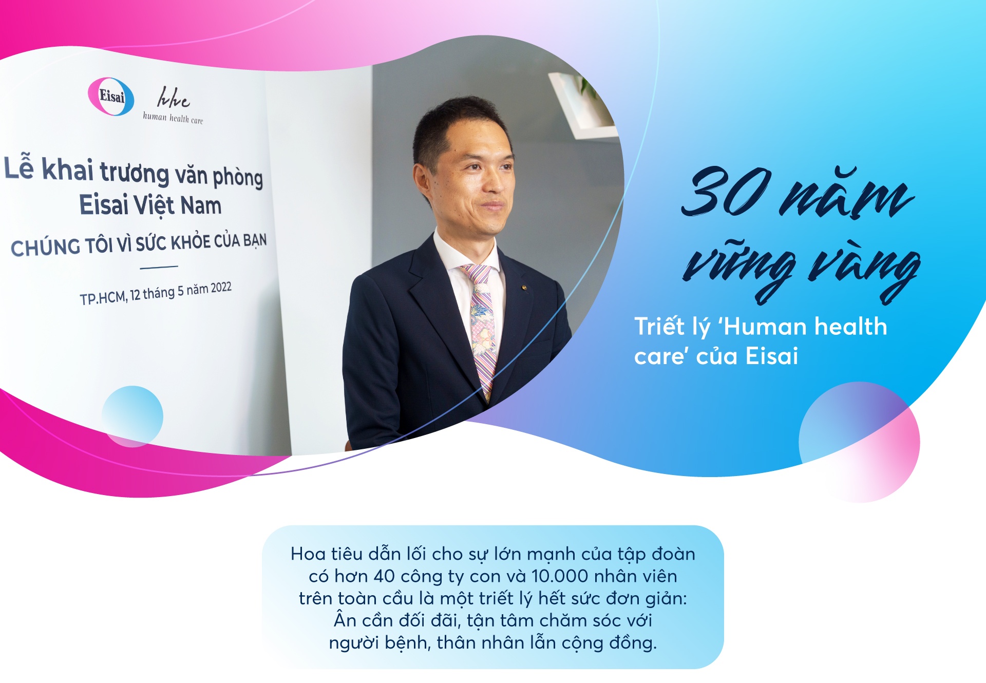 “Mỗi năm, Việt Nam có khoảng 180.000 ca bệnh ung thư mới và hơn 120.000 ca tử vong vì ung thư (Globocan 2020). Chúng tôi mong muốn lan tỏa trọn vẹn tinh thần của Eisai và những giá trị chữa lành cho bệnh nhân qua liệu pháp thuốc lẫn tinh thần, trong đó việc xem bệnh nhân như người nhà và chăm sóc sức khỏe cho cả thân nhân người bệnh là mũi nhọn hàng đầu. Tại Eisai, chúng tôi gọi đó là triết lý chăm sóc sức khỏe con người (hhc)".