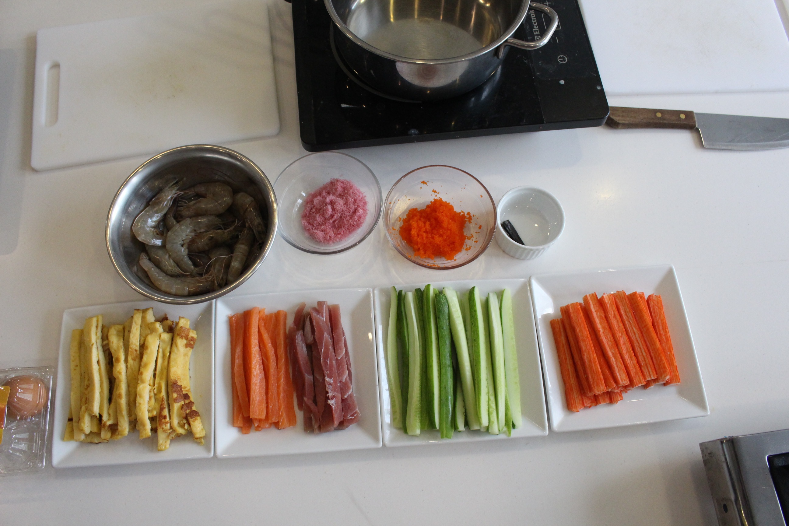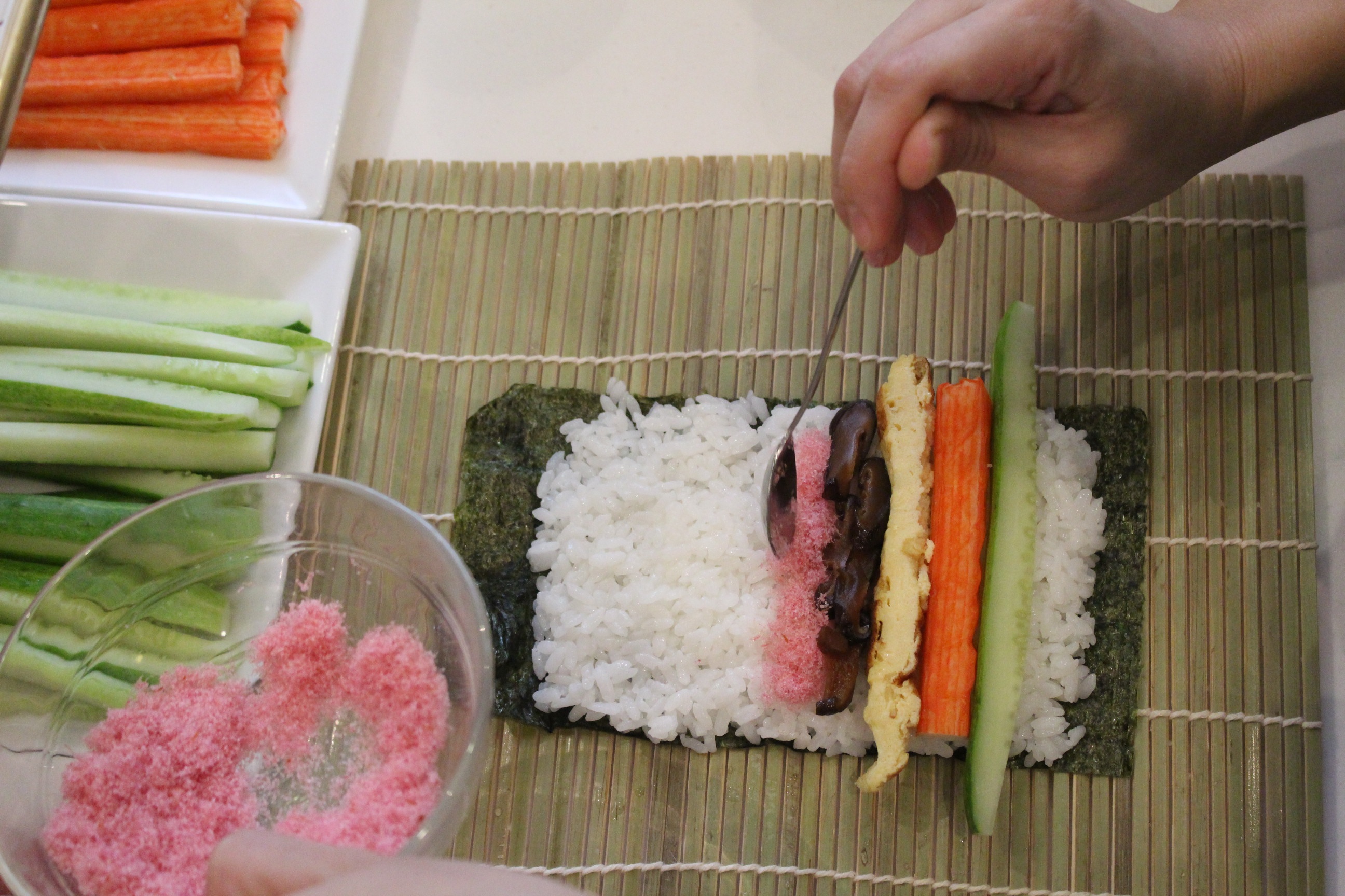 - Bạn đặt tùy ý dưa leo, cà rốt, trứng chiên, cá ngừ đại dương, bột cá hồng, cá hồi, nấm đông cô lên trên, cuộn cơm lại. (Nên chọn khoảng 4-5 loại để khoanh sushi có kích thước vừa phải).