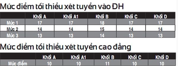 Theo công bố, mức điểm tối thiểu (mức 3) thí sinh phải đạt để được vào học đại học (ĐH) là: khối B: 14 điểm, các khối còn lại: 13 điểm; mức 2: khối B: 15 điểm, các khối còn lại 14 điểm, mức 1 (cao nhất): khối B: 18 điểm, các khối còn lại 17 điểm.