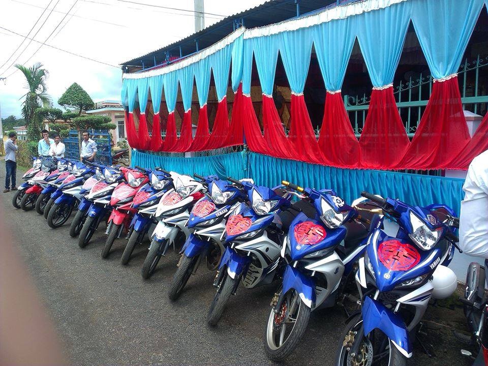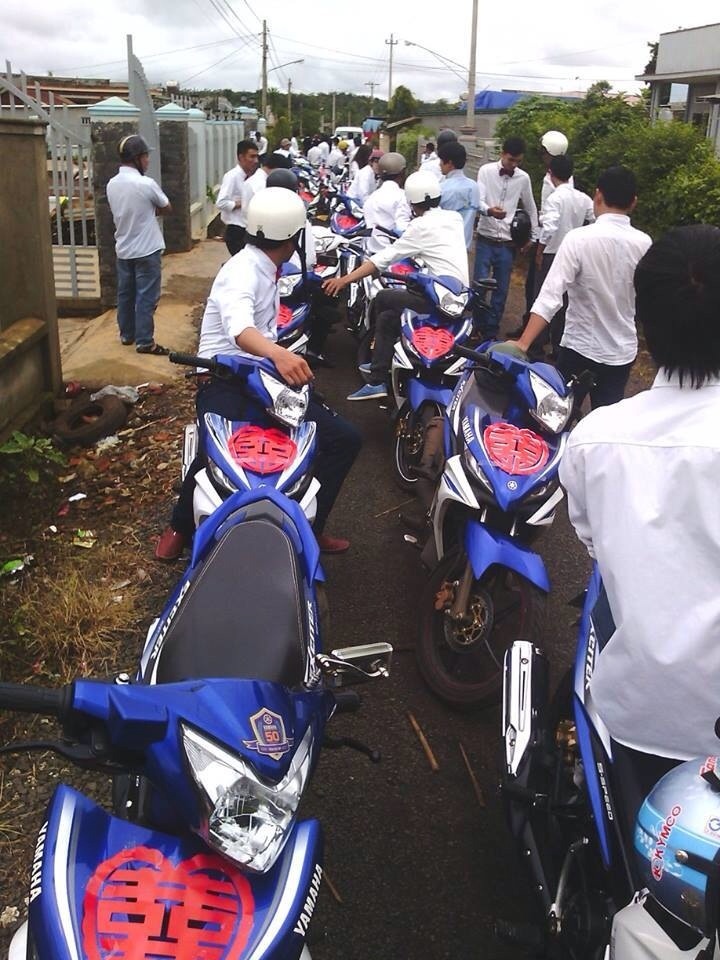 | Đám cưới diễn ra tại phườnng Thống Nhất, thị xã Buôn Hồ, Đak Lak. Khoảng cách từ nhà trai đến nhà gái chỉ 1 km, nên ngoài chiếc xe hoa và một xe chở khách loại nhỏ, dàn xe đi rước dâu toàn những chiếc Exciter. |