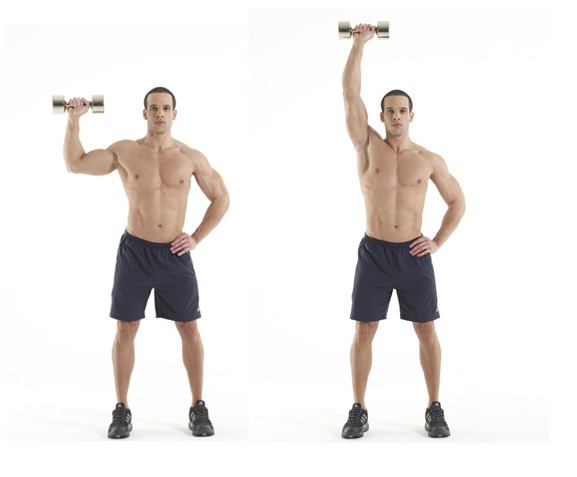 Nâng tạ đơn một tay: Hai chân dang rộng ngang vai, đầu gối hơi trùng. Một tay cầm tạ sao cho quả tạ ngang tầm mắt, cẳng tay vuông góc với mặt đất. Tay còn lại chống ngang hông. Từ từ đầy quả tạ thẳng lên cao rồi hạ xuống vị trí cũ. Làm như vậy 10 lần đối với mỗi cánh tay. Lưu ý, giữ cho lưng luôn thẳng và cơ thể thăng bằng. Bài tập này tác động chủ yếu tới vùng cơ cánh tay nhưng nếu tập đúng cách cũng giúp các múi cơ phía bụng trên nảy nở, săn chắc. Ảnh: Idieafit.