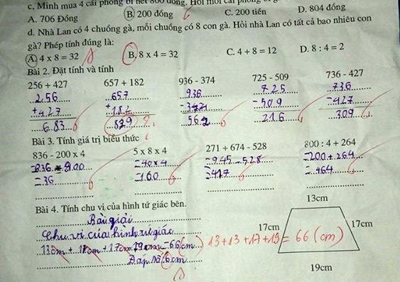 Đặc biệt, trong bài làm giáo viên đã không chấm điểm khi học sinh này lựa chọn đáp án A (4x8=32) và đưa ra phép tính đúng phải là (8x4=32).