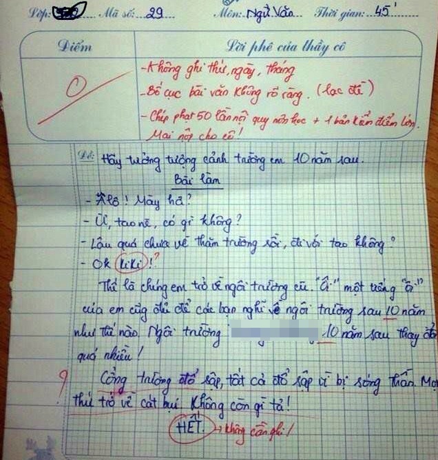 Mặc dù bài văn được cư dân mạng đánh giá cao nhưng thực tế tác giả bài viết không chỉ nhận điểm 0 mà còn kèm theo lời phê "ý thức kém, em cần chỉnh sửa ngay" của giáo viên.