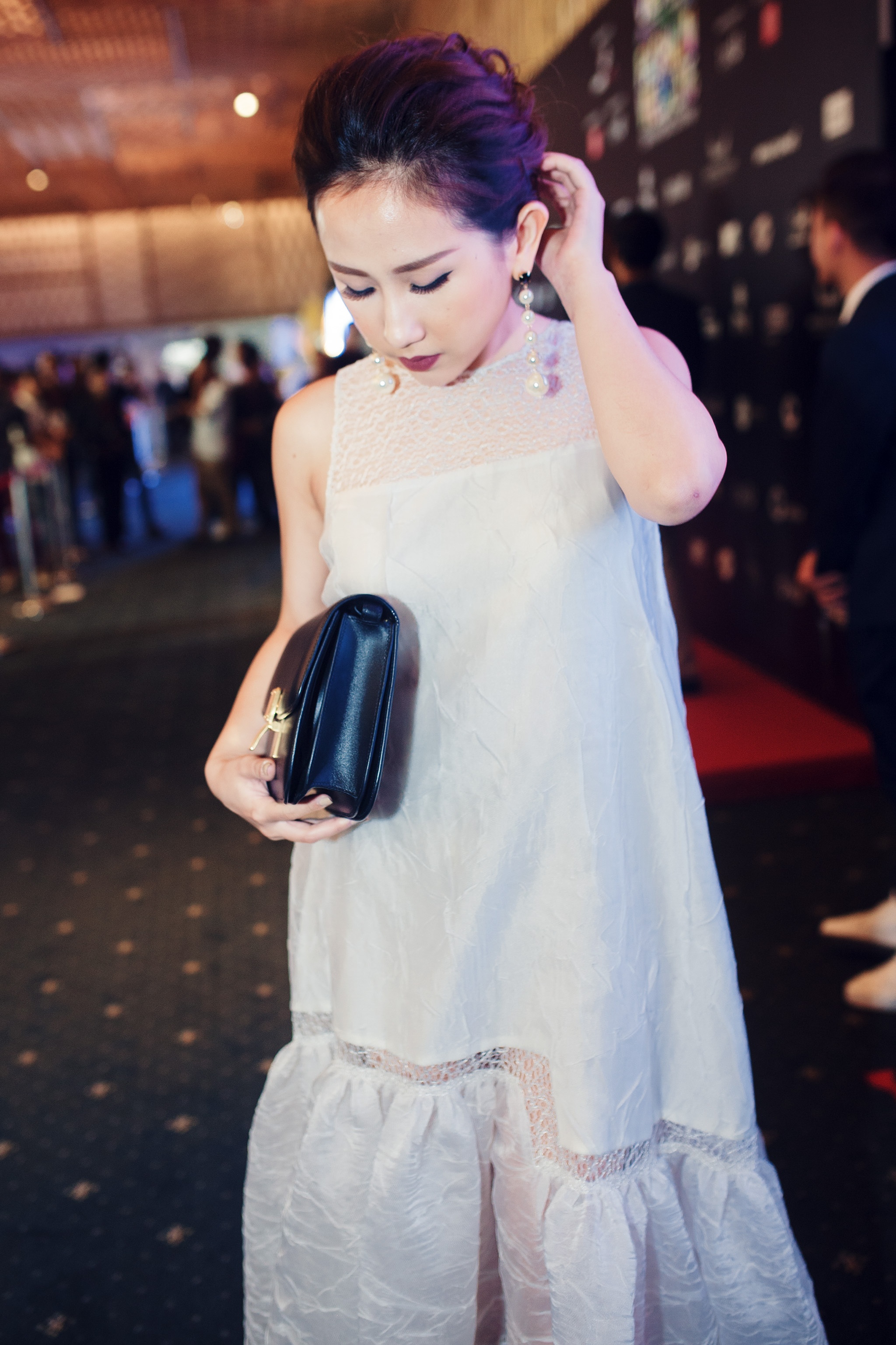 Bí quyết của cô nàng là mix & match trang phục, phụ kiện. Ngày đầu tiên xuất hiện trên thảm đỏ, Trâm Nguyễn ghi điểm với trang phục phom dáng cổ điển, họa tiết đặc trưng của NTK Nguyễn Công Trí. |