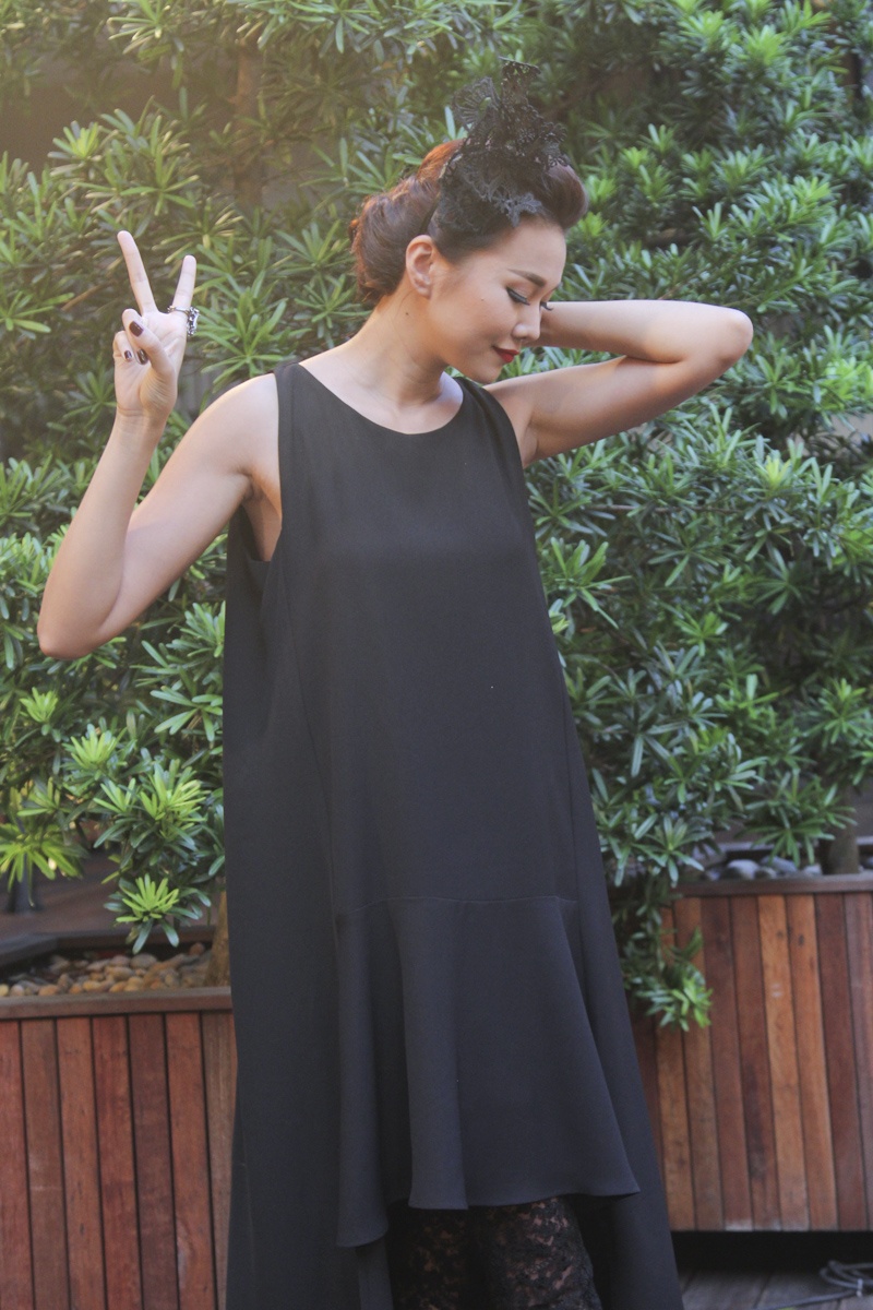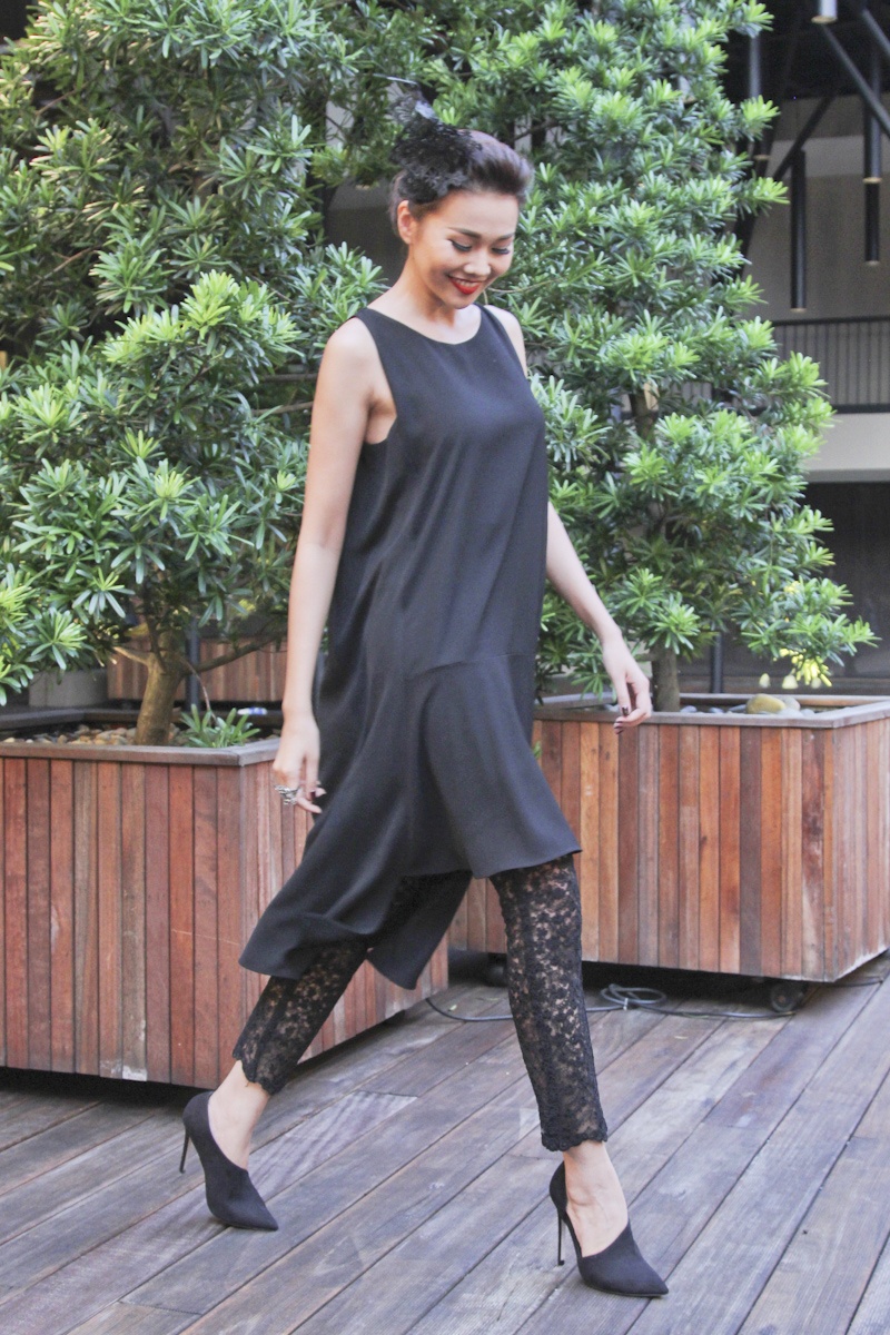 | Ở vòng đánh giá và loại, nữ diễn viên Siêu nhân X diện set đồ cây đen tuyền. Áo suông dài của NTK Lê Hà phối ăn ý cùng quần ren của Đặng Hải Yến, mũ cá tính của thương hiệu Kan Kanemura. |