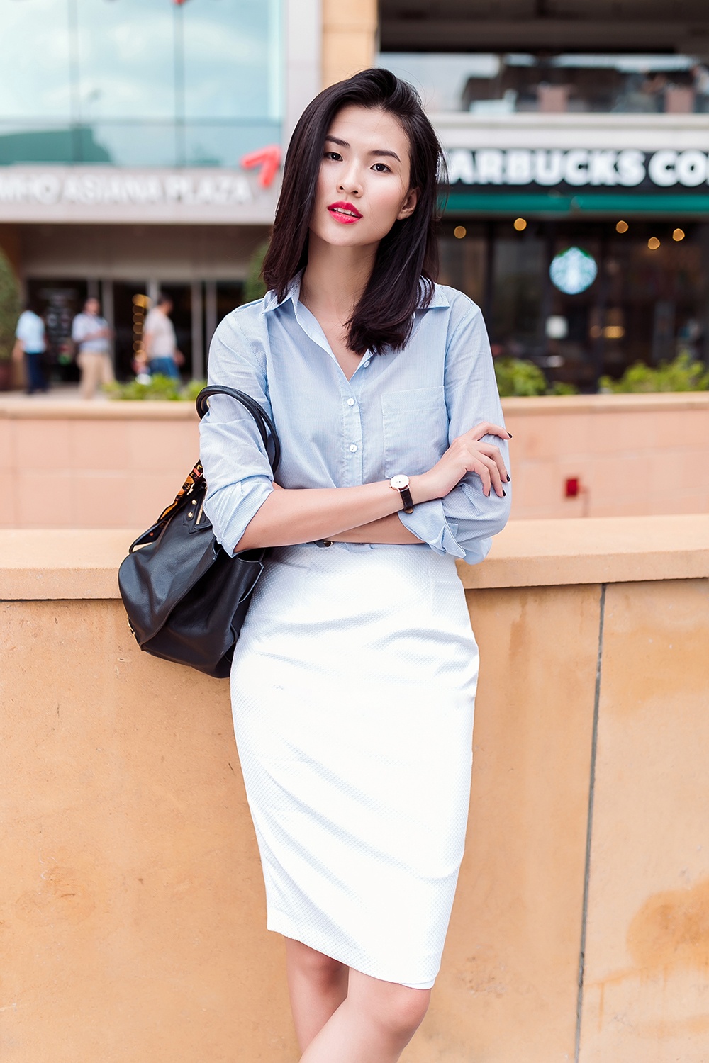 | Trong bộ ảnh mới, người mẫu Thiên Trang giới thiệu cách mix sơ-mi cùng chân váy, quần shorts phổ biến. Sơ-mi đơn sắc kết hợp váy "bút chì" sáng màu là chọn lựa được giới văn phòng yêu thích. Tông xanh nhã và trắng trơn mang đến vẻ thanh lịch cho người mặc. |