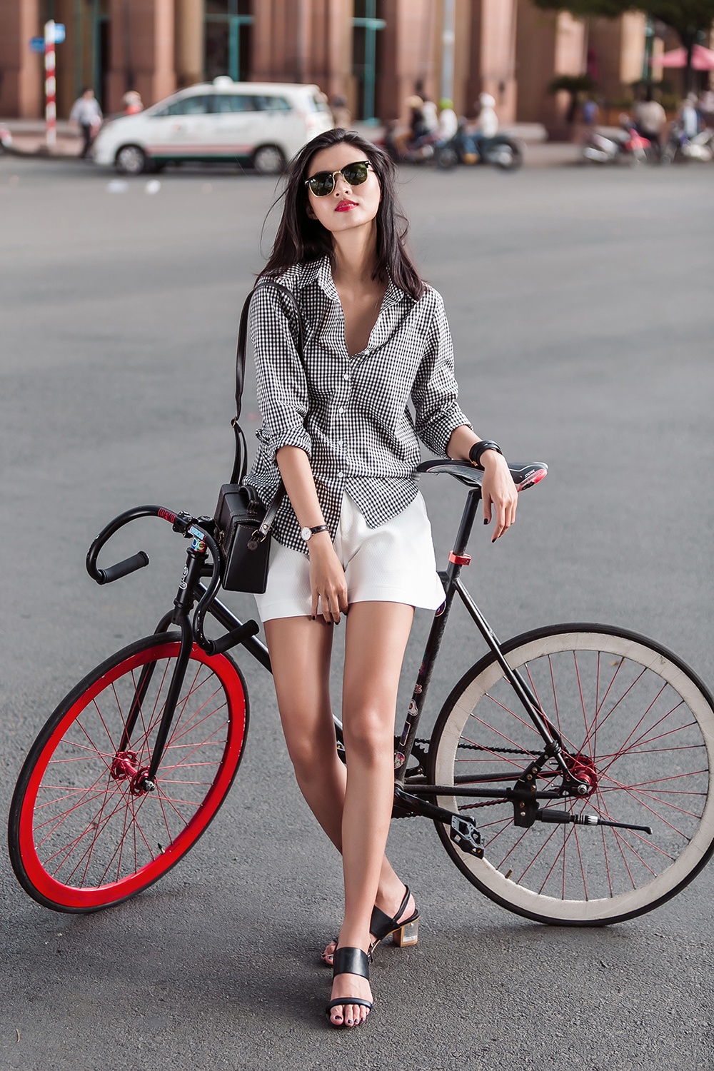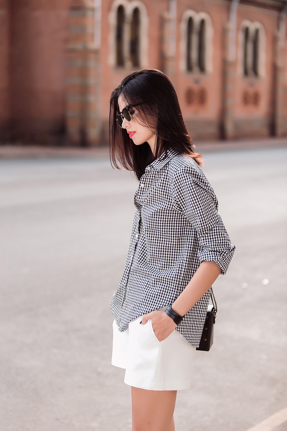Sơ-mi họa tiết ca-rô tượng trưng cho nét cá tính, năng động. Thiết kế bắt nguồn từ thập niên 1970 được nữ người mẫu mix hiệu quả cùng quần shorts trẻ trung.
