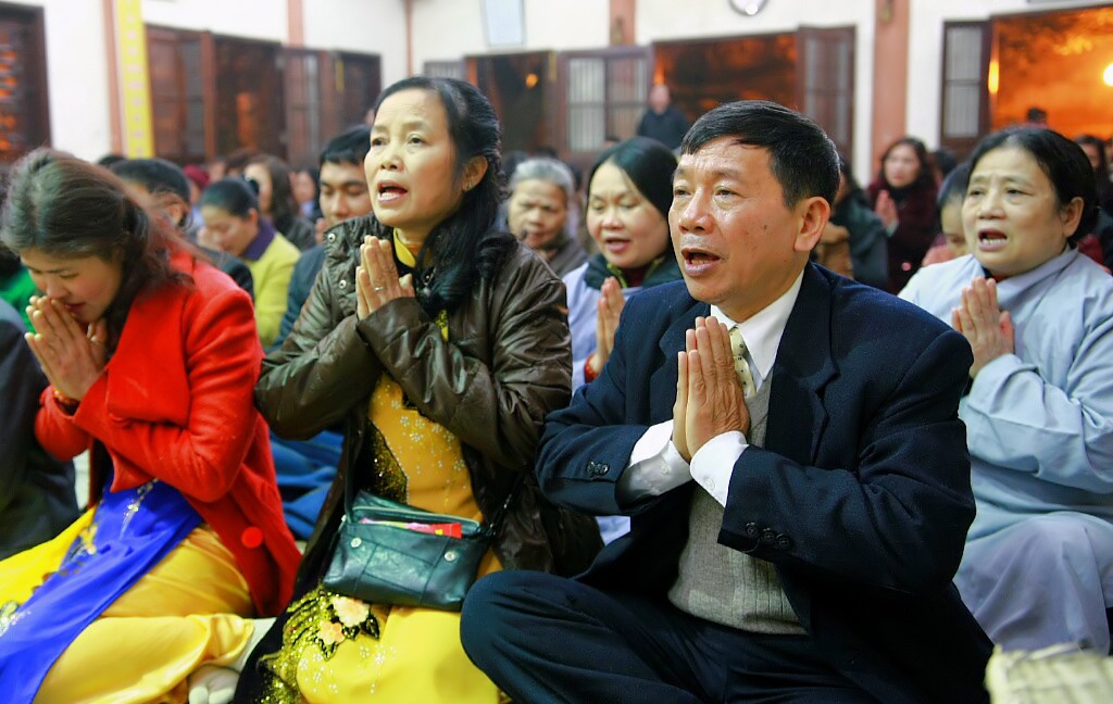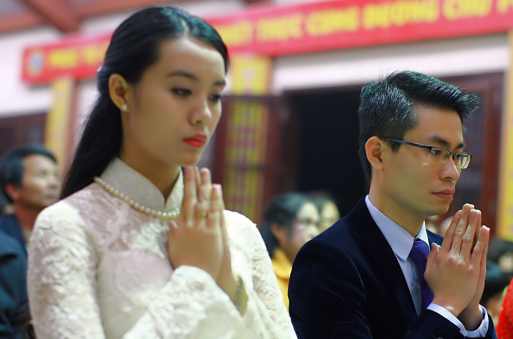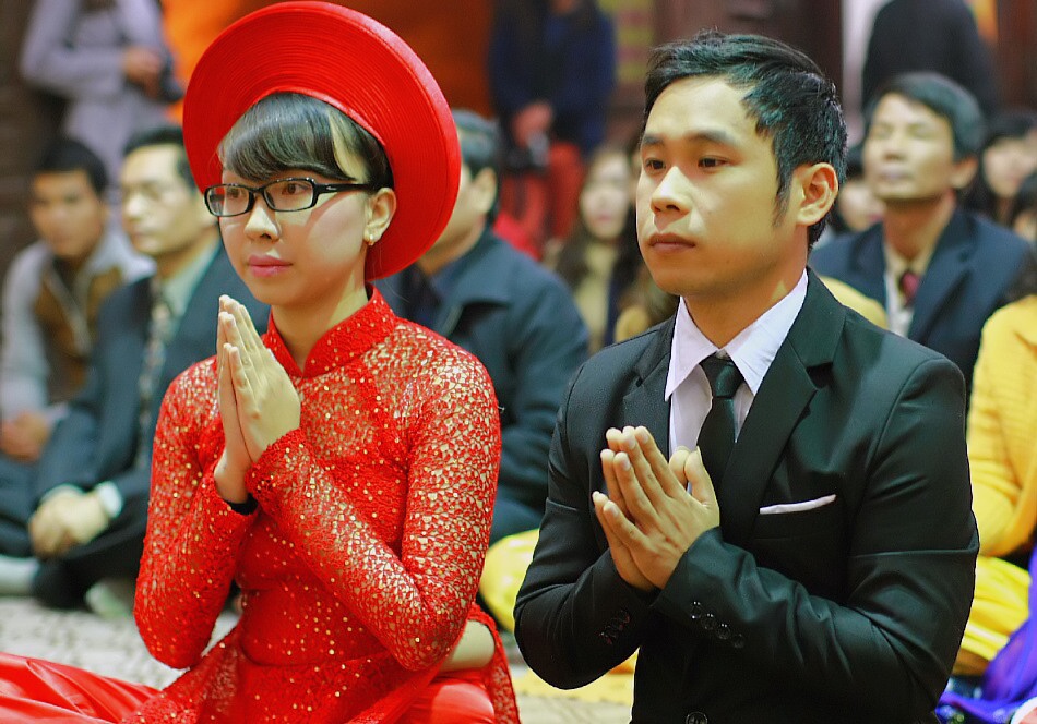 | Tương tự như vậy là cặp Nguyễn Trung Khánh (31 tuổi) và Hoàng Minh Trang (24 tuổi). Đôi bạn trẻ ngồi chờ các nhà sư làm lễ. |