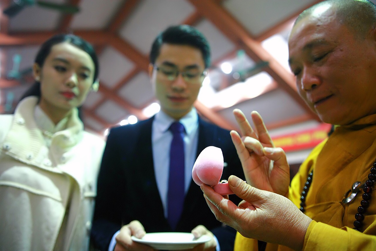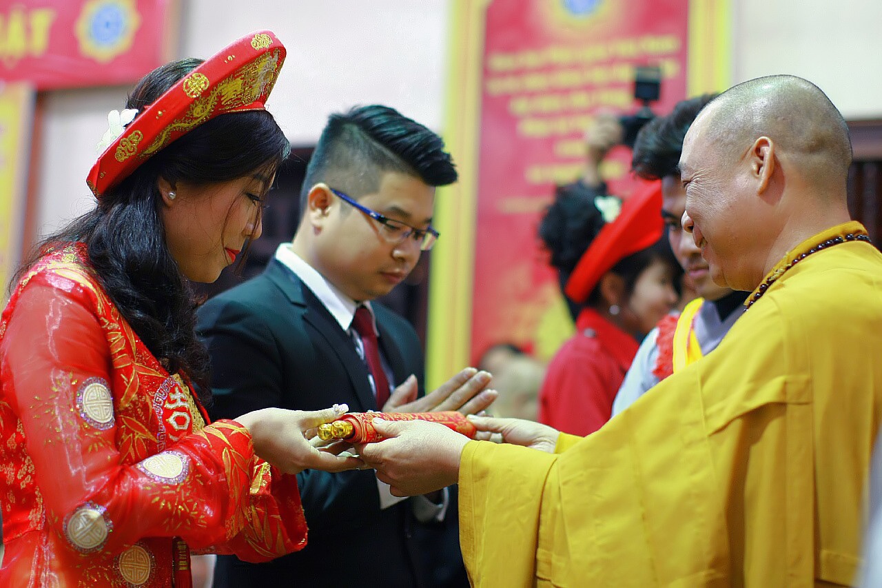 | Chuẩn bị trao nhẫn cưới dưới sự chứng kiến của nhà Phật và quan viên hai họ. |