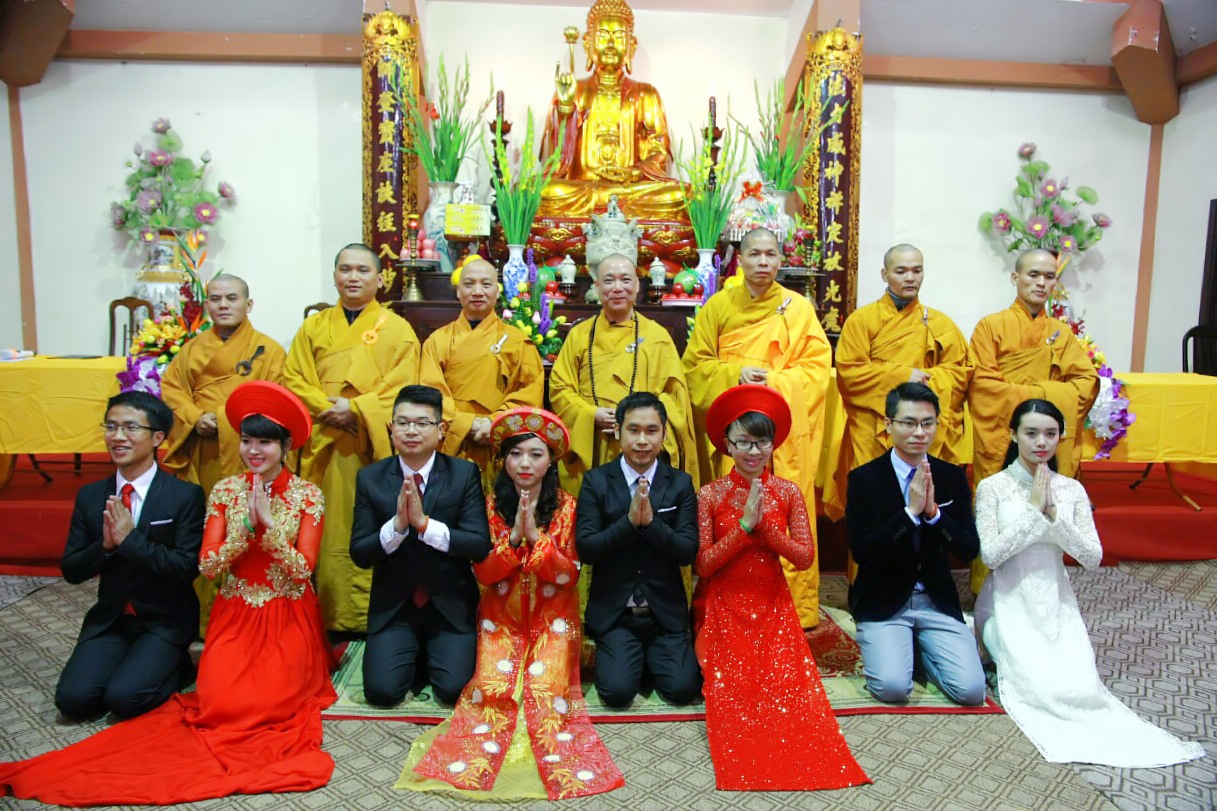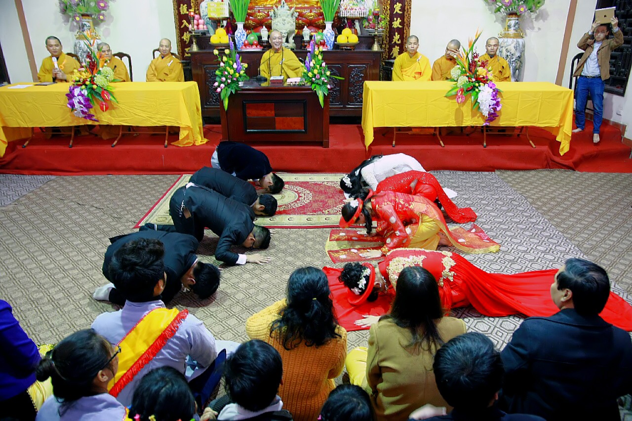 | Cũng tại buổi Hằng thuận, các đôi tân lang, tân nương đã được Hòa thượng trụ trì giảng về đạo nghĩa vợ chồng theo tinh thần kinh Thiện Sinh, đồng thời làm các nghi lễ quỳ lạy cha mẹ và đọc lời phát nguyện kết hôn. |