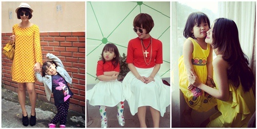 | Mi Vân vốn ưa thích những trang phục nữ tính với tông màu nóng như đỏ, vàng, nên khi 2 mẹ con diện đồ đôi trông rất nổi bật. |