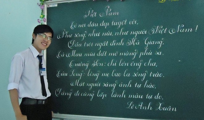 | Lê Văn Thiệu - thầy giáo 9X bên nét chữ đẹp như in của mình. Ảnh: NVCC. |
