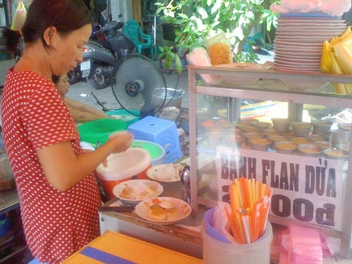 Khác với nguyên liệu thông thường của món bán flan là sữa, trứng gà và caramel, bánh flan bán trong con hẻm 14 Trần Bình Trọng (Q. 5), là bánh flan làm bằng nước cốt dừa. Độc đáo như vậy nên không lạ khi món ăn này lan truyền nhanh chóng trong giới trẻ mê quà vặt và thương hiệu này có hẳn 17 năm tồn tại.