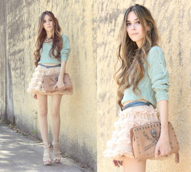 Một vẻ ngoài vô cùng nhẹ nhàng và nữ tính với áo len oversize mix cùng chân váy xòe xinh xắn, cùng tông màu camel lãng mạn. Nhấn nhá chút màu sắc với tông đen và xanh của túi và giày giúp phụ kiện và trang phục hòa quyện với nhau. |