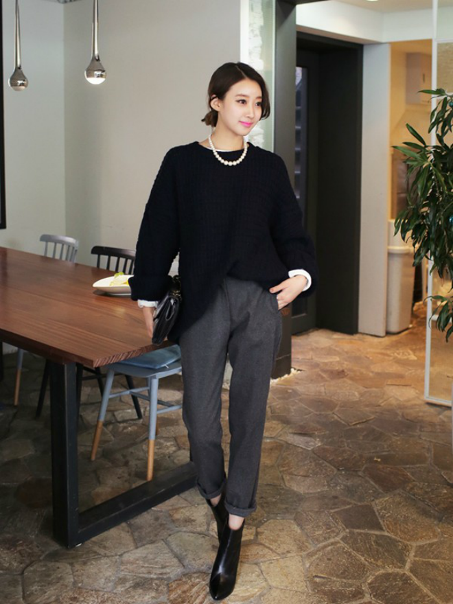 Chiếc áo len đen kiểu cách và quần jeans, giày cao gót là set đồ mang lại sự tươi trẻ, năng động cho bạn gái. |