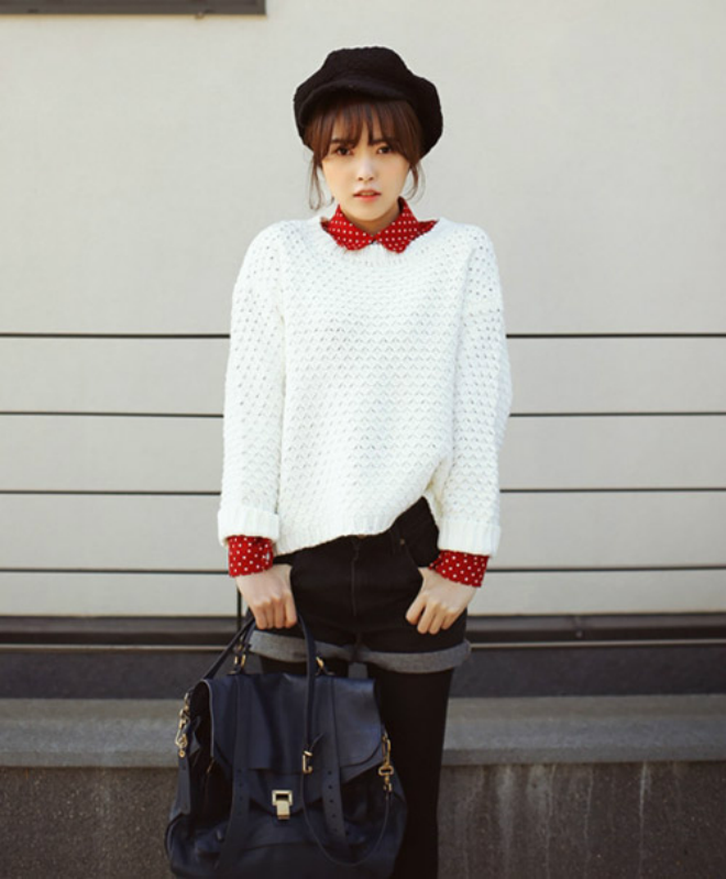 Những chiếc sơ mi họa tiết bên trong sẽ khiến cho áo len màu trắng trơn tưởng như vô vị trở nên bắt mắt và dễ thương hơn. |