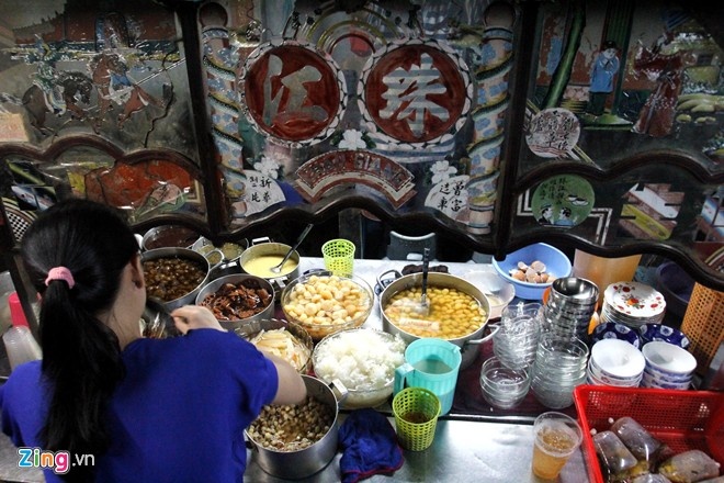 | Nằm nép trong một tru điện nên quán chè này còn được biết đến với cái tên chè cột điện. Quán chè này có khoảng 20 món chè, trong đó, có một số món chè đặc trưng của người Hoa như chè hột gà, chè mè đen, bạch quả... Ảnh: Hải An |