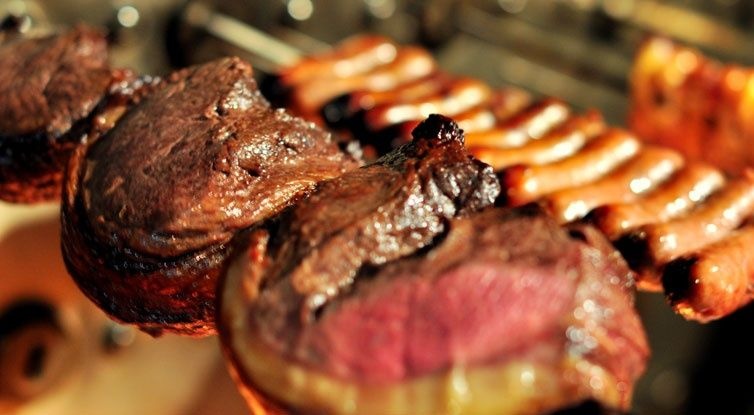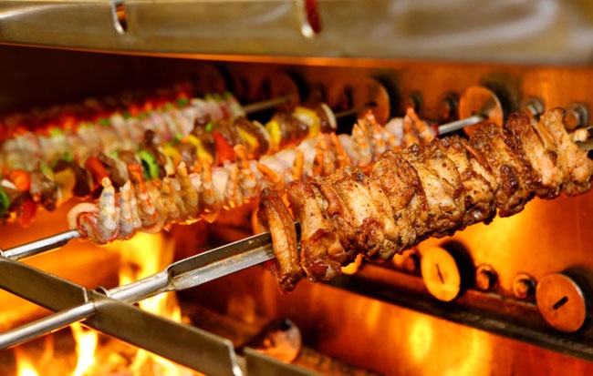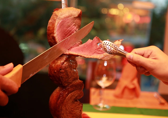 Buffet (tiệc đứng) thường được mặc định “tự phục vụ”, ai thích ăn gì, uống gì thì lại quầy lấy, rồi rời đi chỗ khác hay đến bàn thưởng thức. Buffet Brazil cũng vậy. Song có hai lý do để bạn chọn buffet Brazil để trải nghiệm. Một là nhà hàng đã thiết kế gian bếp mở, thực khách có thể nhìn tường tận quy trình chuẩn bị vật liệu, chế biến món ăn. Hai là trong danh sách hơn 200 món ăn, có 5 món nướng được đầu bếp vác thịt và dao đến bàn phục vụ cho từng vị khách.
