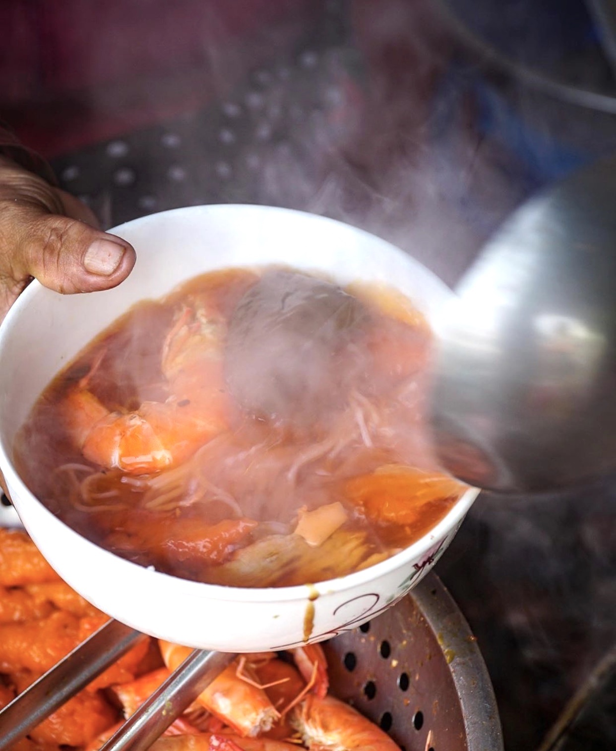 | Bạn có thể trải nghiệm hương vị mới lạ này vào buổi sáng ở đường Bến Vân Đồn, quận 4. Ngoài nhân tôm, giò nạc, huyết, rau, giá cũng được kết hợp. Tô bún có giá từ 40.000 đồng được chuẩn bị chất lượng với nước mắm me pha tương ăn kèm hấp dẫn. Ảnh: Foodholicvn. |