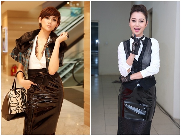 | Thanh Hằng và Đinh Hương cùng diện mẫu váy bút chì plastic đơn giản nhưng không kém phần mạnh mẽ. |