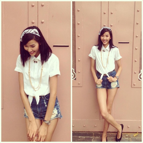 | Người mẫu Hoàng Thùy ứng dụng khá thông minh với kiểu mốt này khi diện áo sơ-mi thắt eo cá tính, phóng khoáng. |