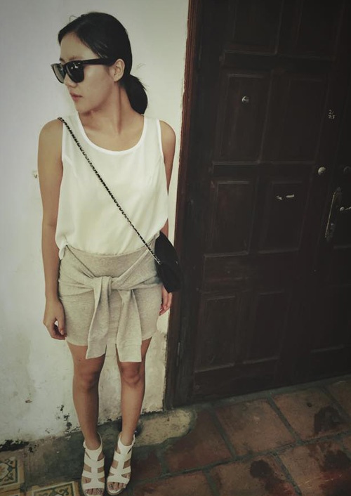 | Kiểu áo buộc vạt trông dễ thương và hiện đại phù hợp với hình ảnh tinh nghịch vốn có ở Hoàng Thùy. |
