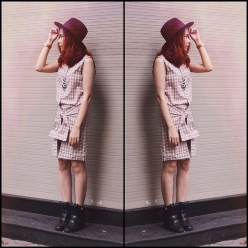 | Bà mẹ một con Lưu Hương Giang trẻ trung trong mẫu trang phục thắt nút tại thân trước. Bộ ánh mix ăn ý cùng phụ kiện giày và mũ fedora. |
