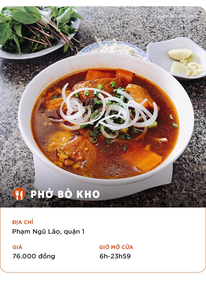 Thay vì sử dụng nước hầm xương, món phở bò có hương vị độc đáo của gừng, sả, thảo mộc cùng các loại củ quả như cà rốt, hành tây... Khác với món hủ tiếu bò kho có sợi dai, bánh phở ăn kèm mềm, tan, kết hợp hoàn hảo cùng nước dùng đậm vị. Quán cũng có những món truyền thống cho bạn lựa chọn như phở nạm, bò viên, tái gân...