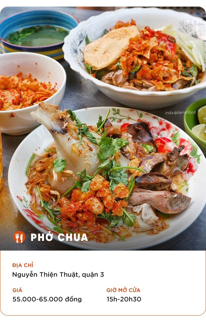 Quán phở chua Lạng Sơn ở quận 3 gây ấn tượng thực khách với bát ăn đầy ắp nguyên liệu như thịt, dưa leo, rau thơm, hành phi, lạc rang cùng nước sốt chua sóng sánh bên trên. Tô đặc biệt sẽ có thêm gà và tóp mỡ, giá 65.000 đồng. Cháo sườn, bánh giò, gỏi gà là những món hấp dẫn không kém trong thực đơn của quán.