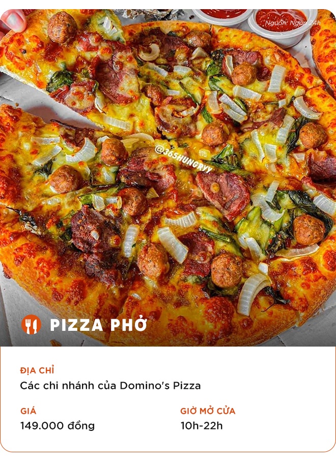 Pizza phở là phiên bản sáng tạo mới lạ lấy cảm hứng từ món nước truyền thống của ẩm thực Việt Nam. Topping của bánh là những thành phần cơ bản của tô phở như thịt thăn bò tái, giá, rau húng và nước dùng phở cô đặc. Tương ớt, tương cà vẫn là những gia vị đi kèm quen thuộc.
