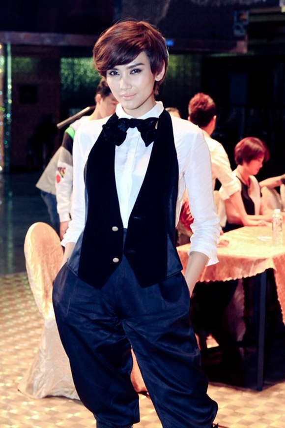| Hoàng Yến gây chú ý trong một sự kiện của năm 2013 với mái tóc tém và trang phục đậm chất menswear. Phong cách này không hợp với người đẹp. Rất may, đây chỉ là tóc giả, và Hoàng Yến vẫn giữ nguyên mái tóc dài cùng phong cách thiên về nữ tính, quyến rũ nhiều hơn. |