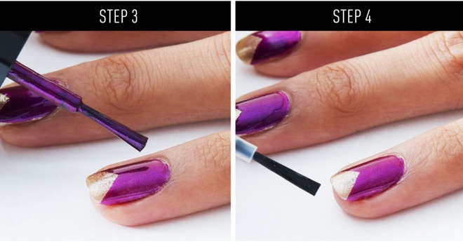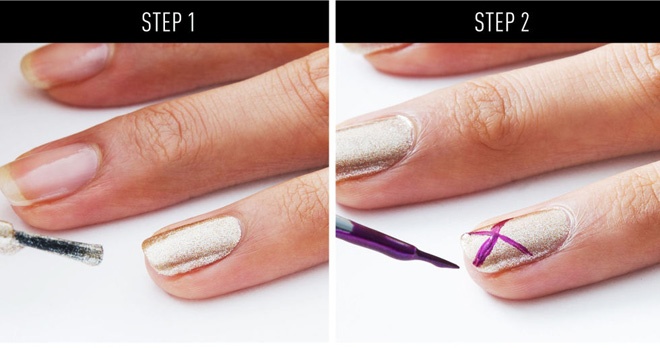 | Không khó và cũng chẳng đòi hỏi phải khéo tay quá mức, chỉ cần 4 bước đơn giản bạn sẽ tạo nên một kiểu sơn móng đẹp và “độc”. Trước tiên cần chuẩn bị 1 lọ sơn móng màu tím cánh sen và 1 lọ sơn móng màu vàng meltalic. Bắt đầu bằng cách phết 1 lớp sơn màu vàng meltalic lên móng. Để sơn khô trước khi dùng cọ đầu nhỏ hoặc tăm tạo đường chéo chữ X trên móng tay bằng sơn màu tím cánh sen. |