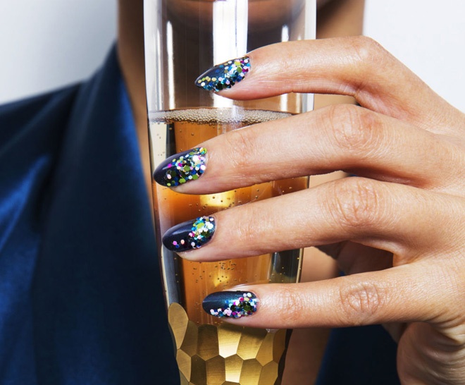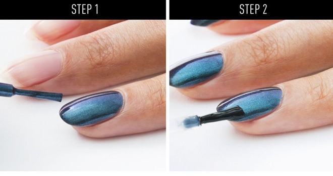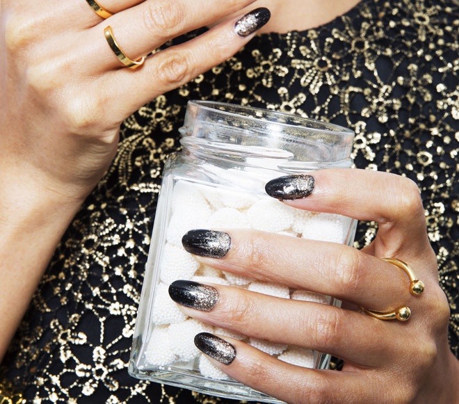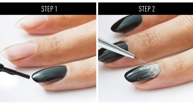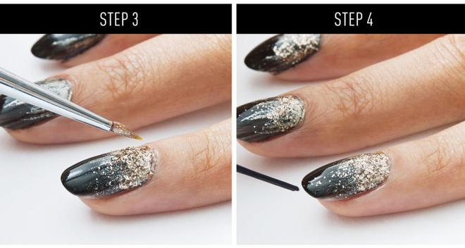 | Đây cũng là kiểu nail khá kỳ công nhưng lại thực hiện khá dễ dàng. Bạn chỉ cần chuẩn bị một lọ sơn đen, 1 lọ sơn ánh bạc và 1 ít hạt bụi meltalic ánh vàng. Phủ 1 lớp sơn đen lên toàn bộ móng, để khô và dùng cọ đầu nhỏ phết 1 ít sơn ánh bạc lên phần góc móng, tán dần lên trên như hình minh họa. |